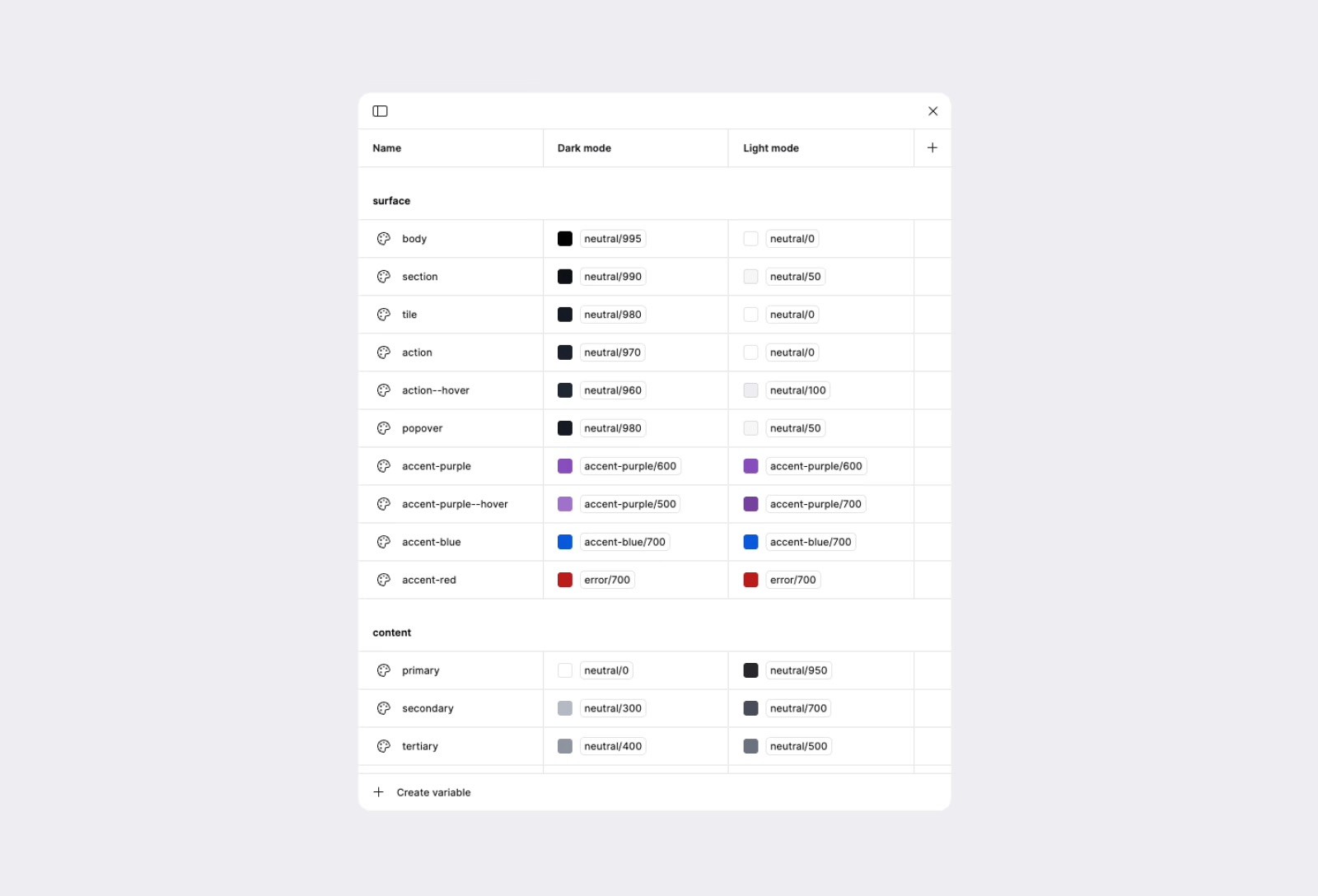 Variable modal containing a list of alias tokens with dark and light modes assigned.