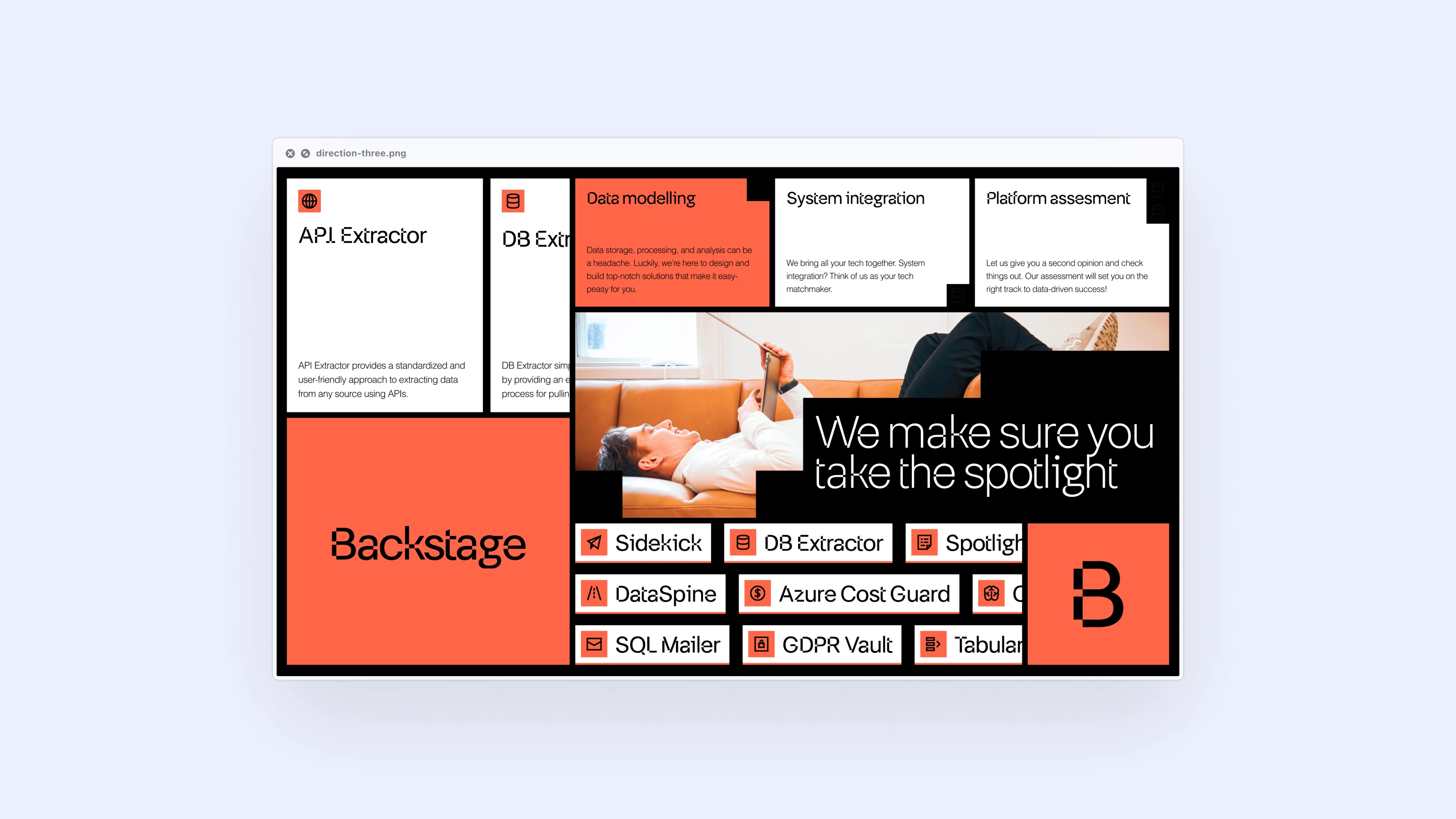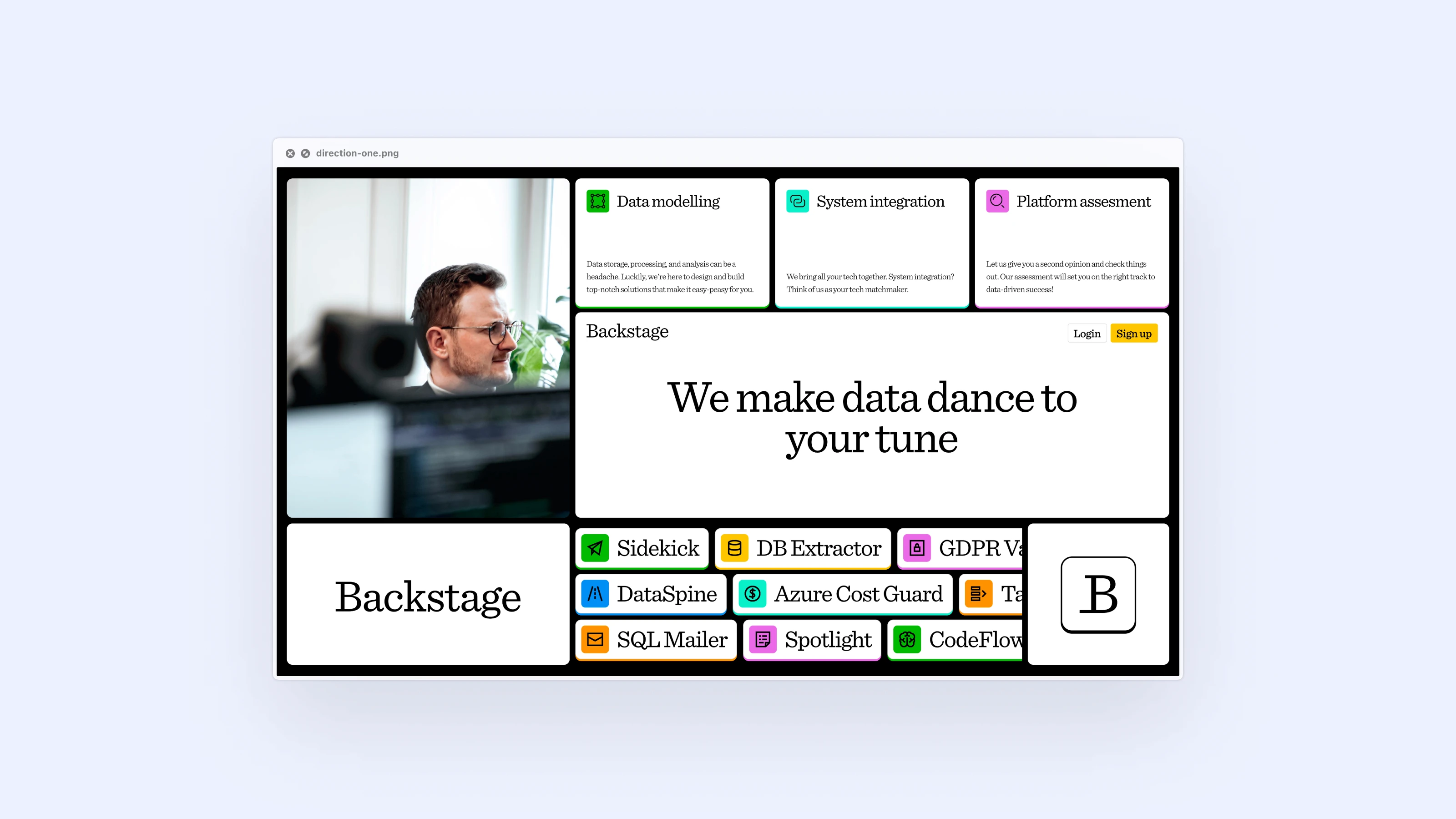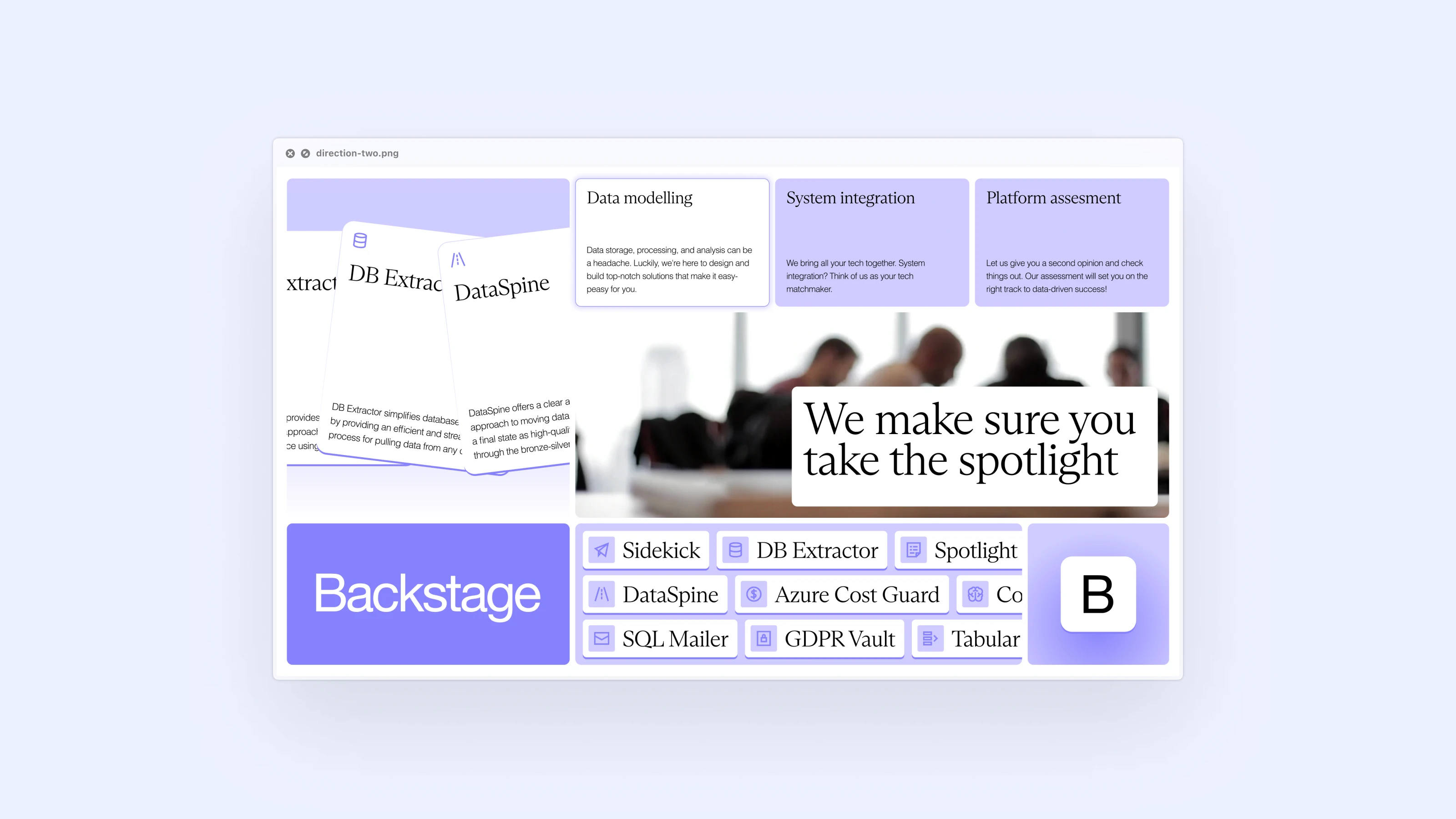 In just one week, our brand sprint focused on crafting a new visual identity for Backstage. We began by exploring three distinct directions, each designed to highlight a different facet of their expertise and vision.